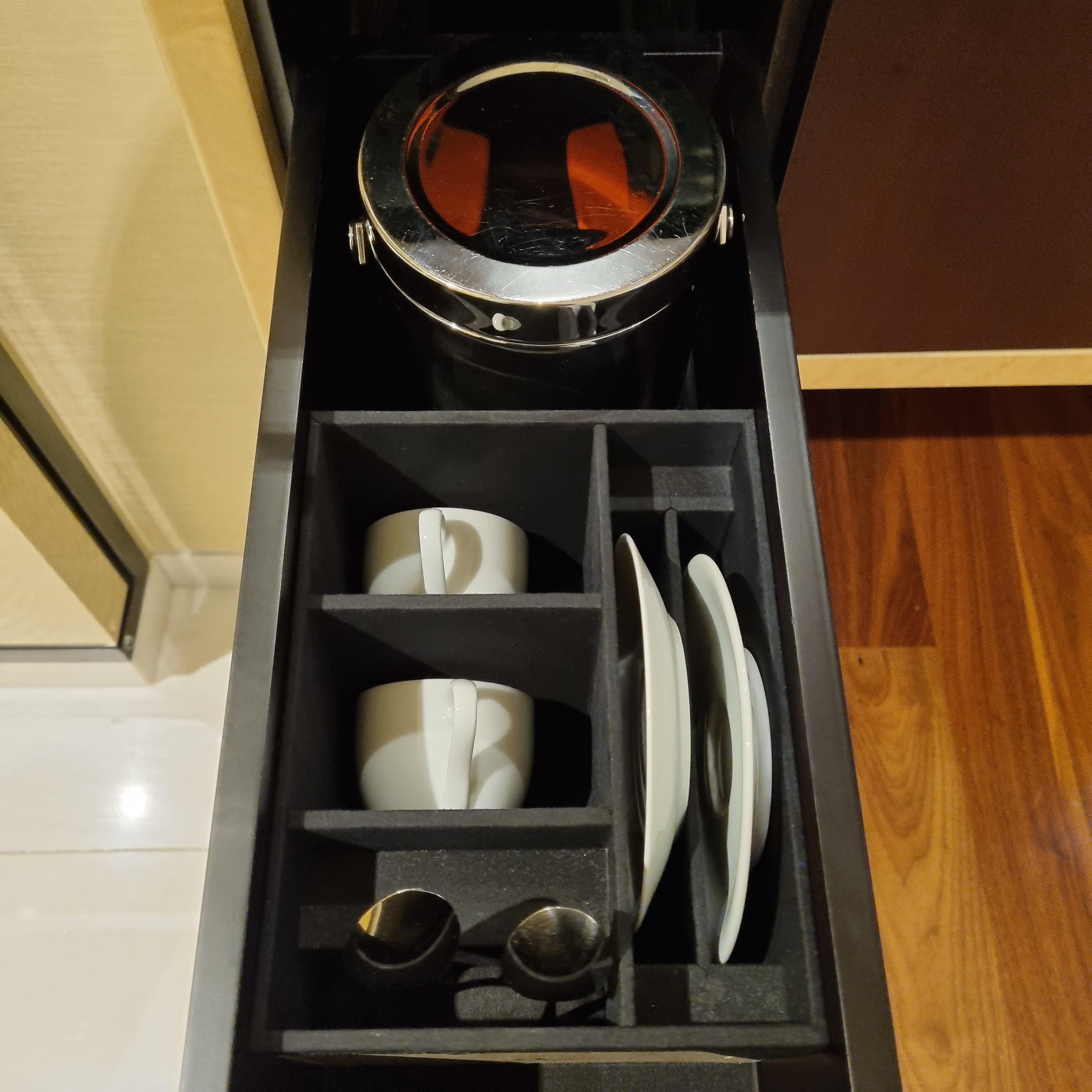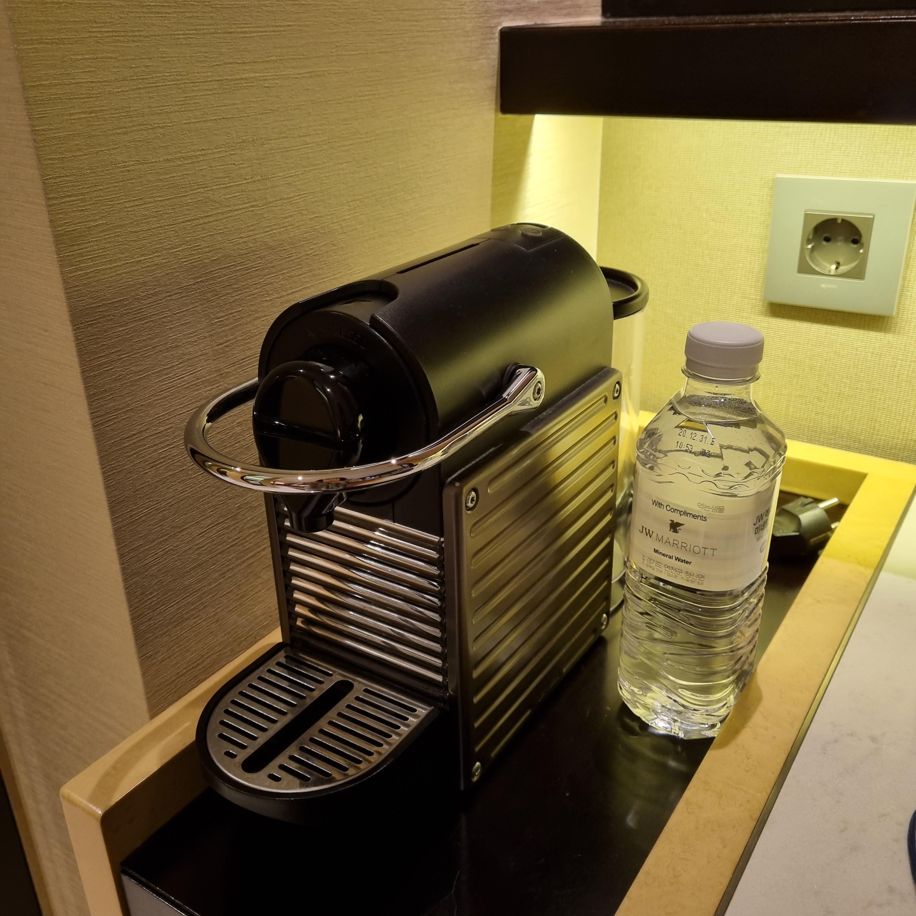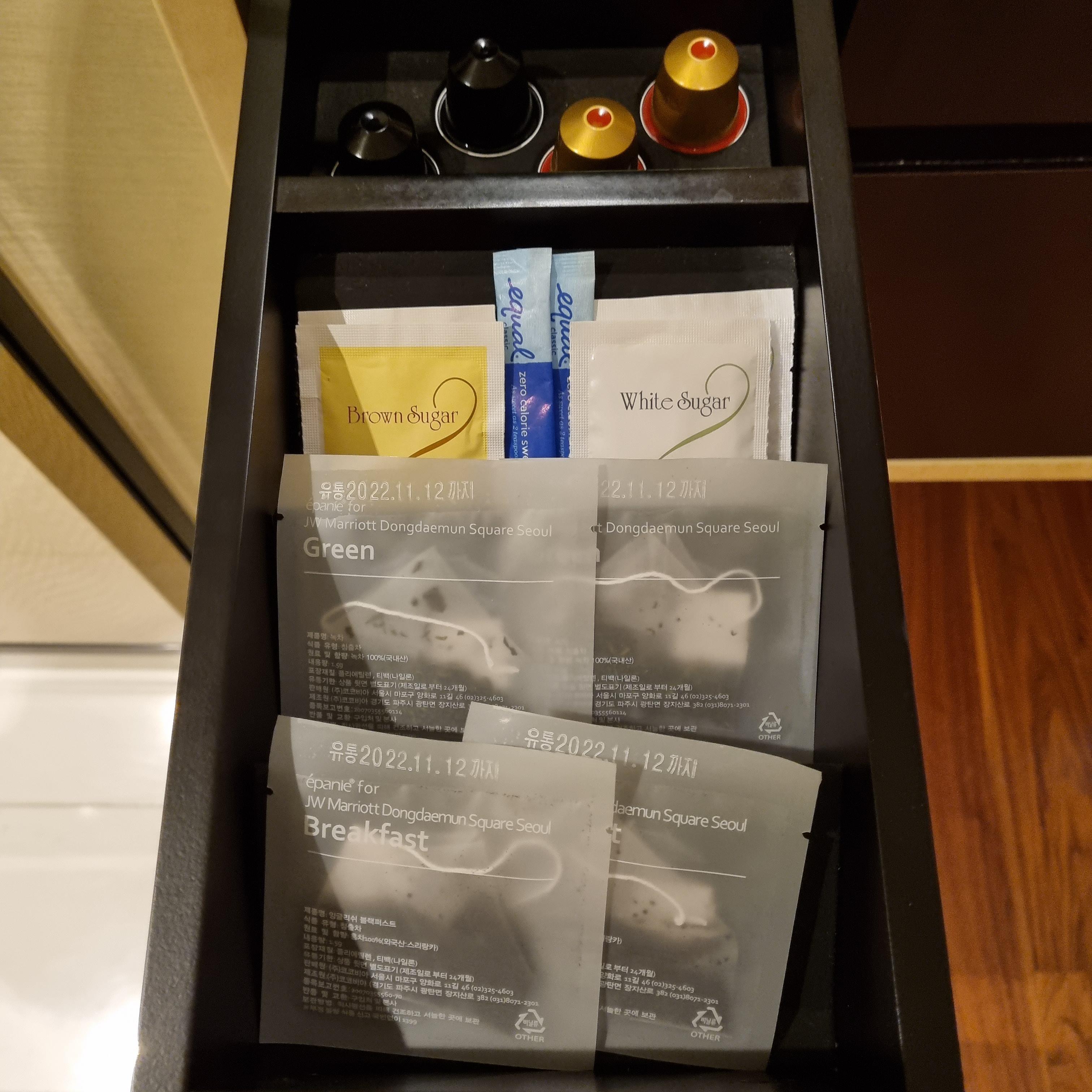 무료 생수3병, 커피머신, 커피포트가 있었습니다. 저희는 이그제크티뷰룸이어서 라운지에서 커피와 티를 마셨기 때문에 객실에서 따로 마실일이 없어서 룸에서는 마시지 않았어요. 원했으면 집에 가지고 왔을 수도 있지만 그냥 놓고 왔습니다.