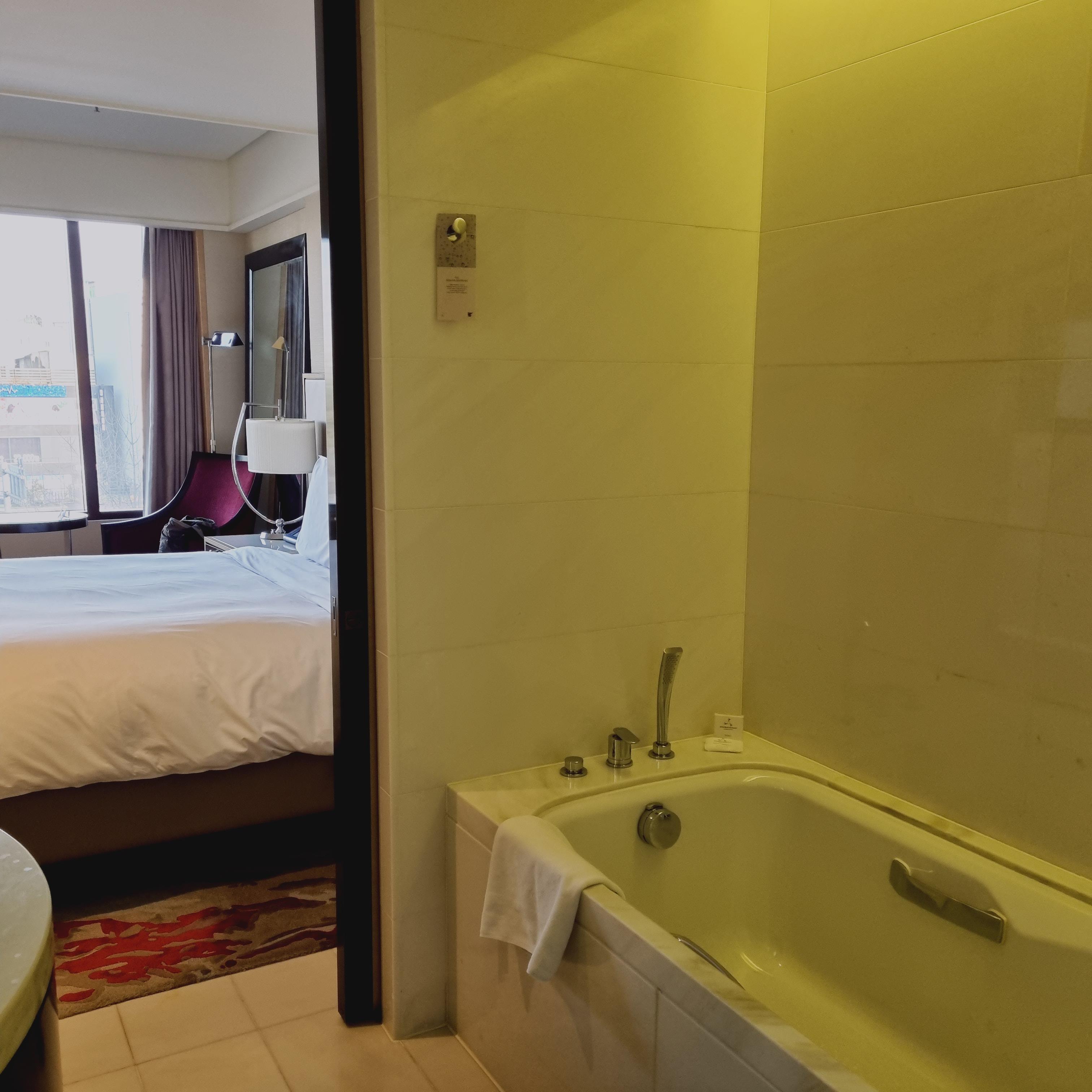 화장실입니다. 역시 5성급 호텔답게 화장실이 아주 좋아요. 첫번째 사진에서 보이는 벽면에 보이는 미니 TV도 있어서 화장실 욕조에서 목욕하면서 미니 TV를 돌려서 티비를 볼 수도 있어요. 잠시도 눈을 못쉬는 저에게 굉장히 좋은 꿀템이었어요. 화장실은 미닫이 문이어서 씻을 때 문 닫고 씻어도 됩니다. 투명한 문 아니고 막혀있는 원목입니다.